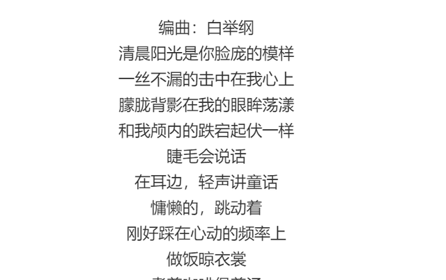 回看歌词,确实浪漫又细腻。白举纲唱到:“清晨阳光是你脸庞的模样,一丝不漏的击中在我心上。”描述了两人生活在一起的场景,还有关于做饭晾衣裳,煮着咖啡煲着汤等场面,看上去两人生活的非常简单幸福,这大概就是白举纲追求的幸福模样吧。