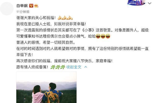 1月8日,男星白举纲发文官宣承认已婚,并感谢大家的祝福,他坦言:“我现在是已婚人士啦,如我所说非常幸福!”白举纲称另一半是圈外人,“普通人的感情,希望一切顺其自然。”