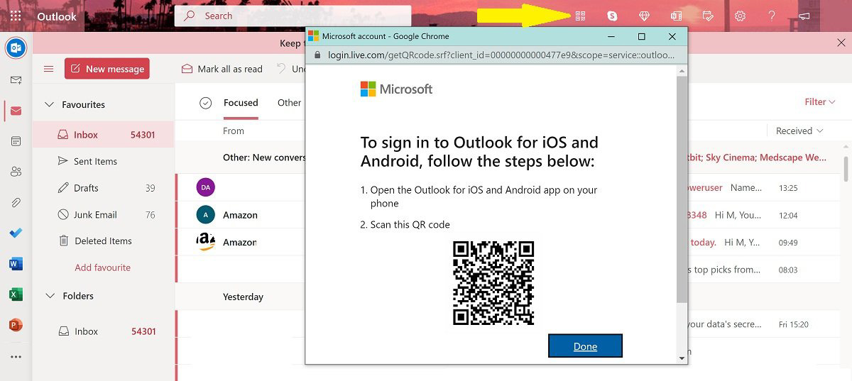 从图中可以看到,微软正在 Outlook 横幅上推出一个新的 QR 码按钮,该按钮会生成一个 QR 码,可用于登录 iOS 和 Android 上的 Outlook 应用,而无需输入密码。