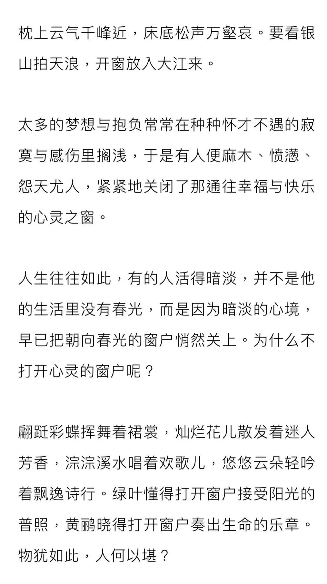 打开心灵的窗户,告别烦恼,告别忧伤,去倾听窗外布谷鸟的叫声,去感受夏天旖旎的绿光,去体味秋天风清云淡的澄澈,去寻找冬天雪花纷飞的悄然……
