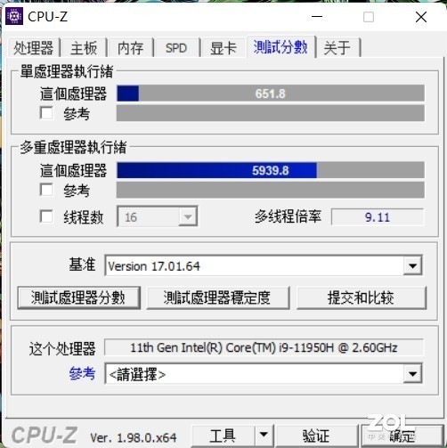 在CPU-Z中,单核性能651.8分,多核性能5939.8分