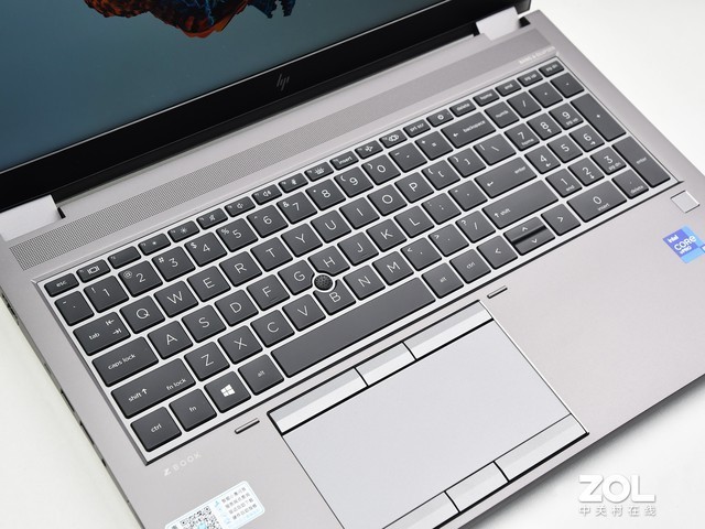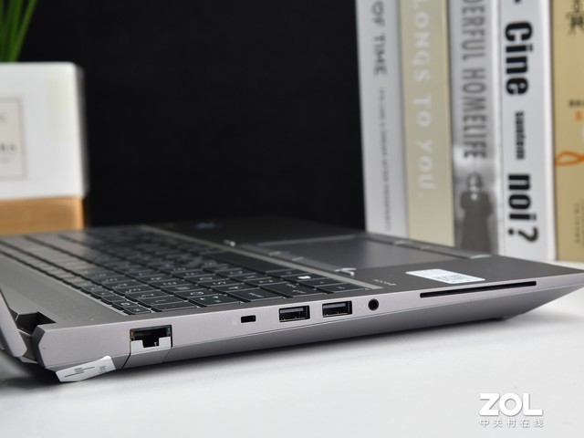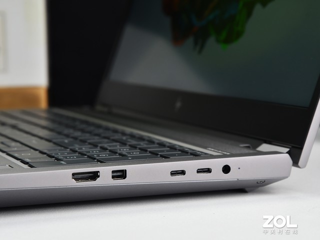 可以看到机器的接口非常齐全,这也是惠普专业图形工作站的必备素养。除了齐全的接口外,在机器两侧我们也能看到,这台ZBook Fury G8采用的楔形收边设计,这让机身在视觉上呈现出了一种更加轻薄的感觉,将更多部分巧妙融合进了机身阴影里,显得机器整体更加锐利、时尚。在这种设计下,机器的最薄处仅为26毫米,15.6英寸的机身起重在2.35千克,对于这个级别的工作站来说已经算是非常轻薄,具备了不错的可移动性。