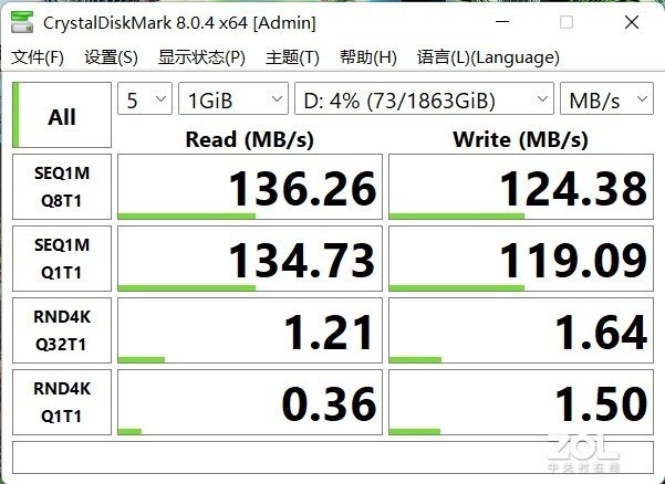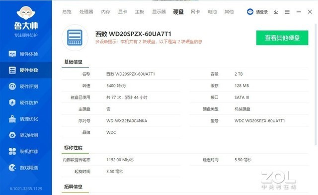 机械硬盘则是一块来自西数的SATA3 2.5英寸机械硬盘,5400转/分,128MB缓存,容量达到了2TB。最大读取速度136.26MB/s,写入速度124.38MB/s。