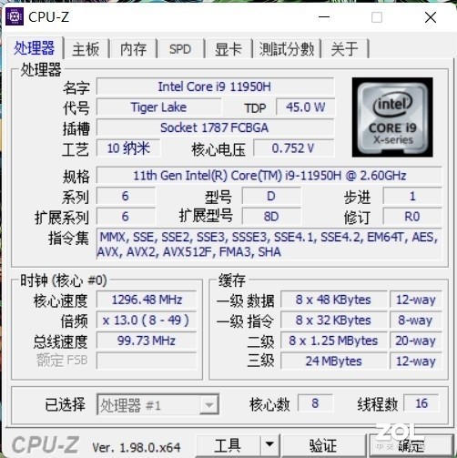惠普专业图形工作站ZBook Fury G8搭载了一颗英特尔i9-11950H处理器,10nm工艺,Tiger Lake架构,八核十六线程,基础频率2.6GHz,最大加速频率5.0GHz,三级缓存24MB,默认TDP 45W。