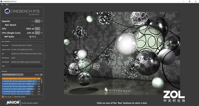 在CINEBENCH R15中,单核性能245分,多核性能1983分