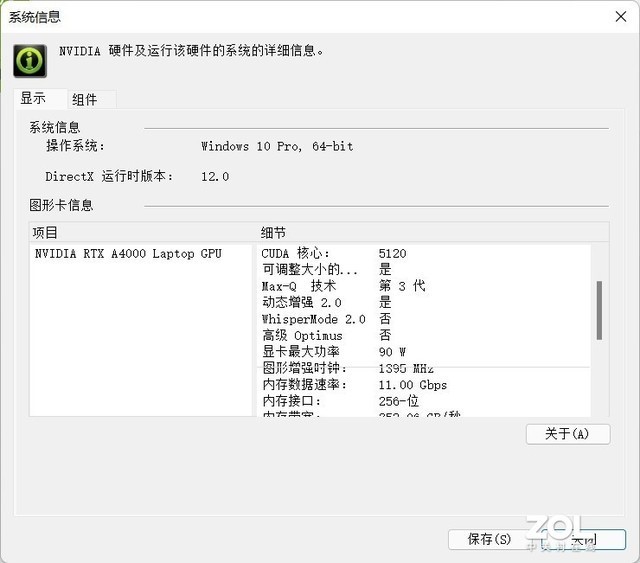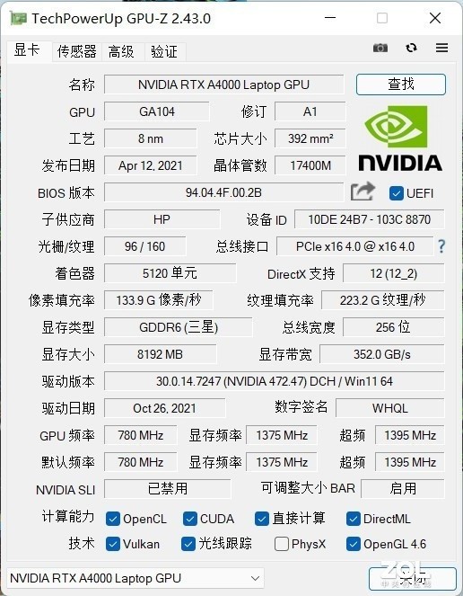 显卡方面,这款机器采用的是英伟达A系列专业显卡,型号为A4000,具体信息如下: