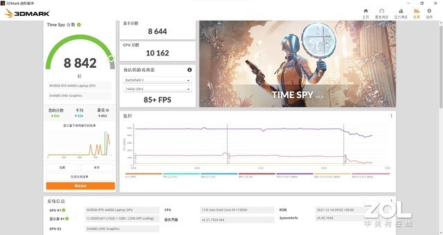 简单测试下传统的DX12图形性能,显卡分数为8644分,比上次的85W版本有着大约5%的性能提升。