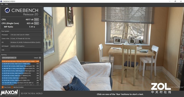 在CINEBENCH R20中,单核性能623,多核性能4617