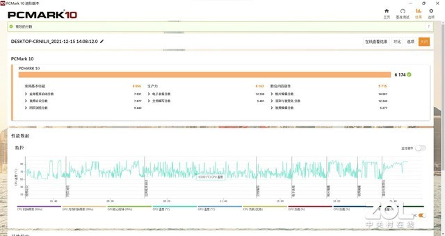 最后是整机的综合性能测试,首先是模拟办公应用场景的PCMark 10,整机得分6174,生产力环节得分8163,其中的电子表格分数更是达到了12338。这反映了惠普专业图形工作站ZBook Fury G8在对应数据科学类工作的强大实力。对于数据工作者来说,从库里调出生成的电子表格往往包含上万行数据,体积达到数GB更是家常便饭,而这款机器优秀的数据处理能帮助这类工作者从容应对每天海量的数据处理工作。