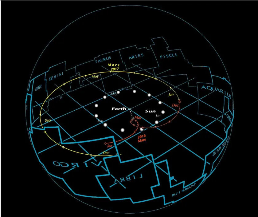 地球在中间;春分的方向是向右的;黄点的斑点是每月初的太阳。