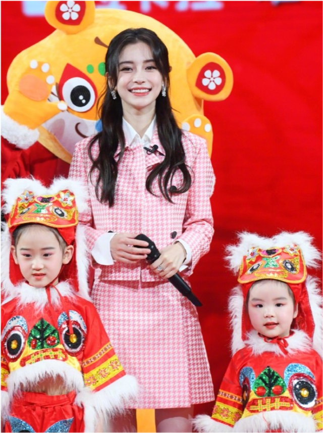 baby的另一套造型看着就很有春晚那股味儿了。baby依然穿着一身粉色的衣裙,看来baby是很喜欢粉色呀!头发半扎半放,笑起来也很亲切,粉色衣服穿在身上,感觉青春靓丽了不少。旁边还有两个年画娃娃,过年气息相当浓厚了。