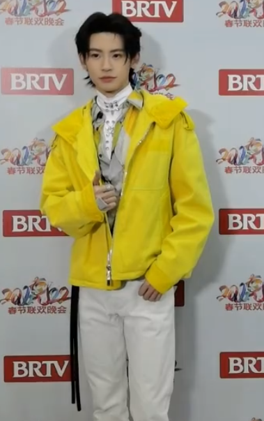 阿云嘎这次穿得比较低调,黑色的外套上嵌套了两竖黄色的扣子,看着不是很亮眼。但没关系,只要歌声好听就行了。