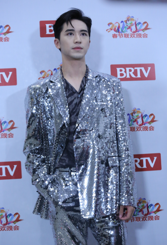 许魏洲穿着一身银色的亮片西装,从衣服到裤子都在闪闪发光。盲猜是会在台上跳舞了。