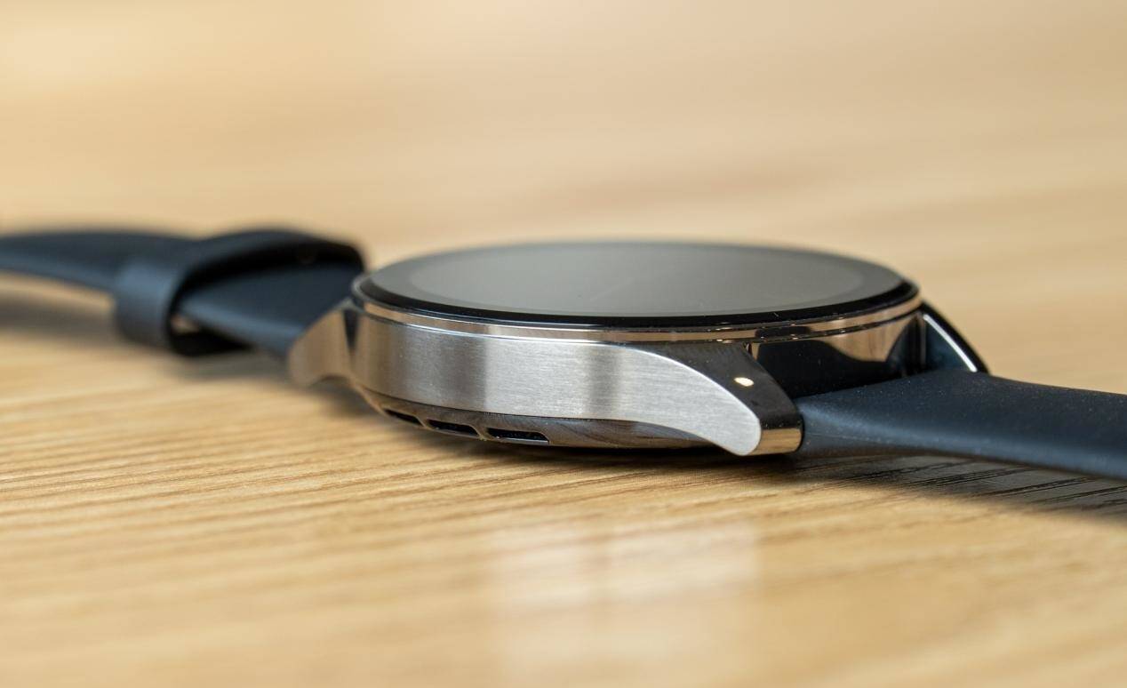 手表外观较2020年9月发布的前代并没有较大的改动,我们拿到的这款配色名为“银翼”,手表正面覆盖了一整块黑色玻璃,表框部分采用了枪银色的金属材质,仔细查看还有一些拉丝工艺在其中,高亮抛光与颗粒拉丝相结合构成了具有层次感的外观设计,表框在材质上使用了316L精钢材料,轻微的磕碰基本造成不了划痕、几天的评测下来依然是完好如初。