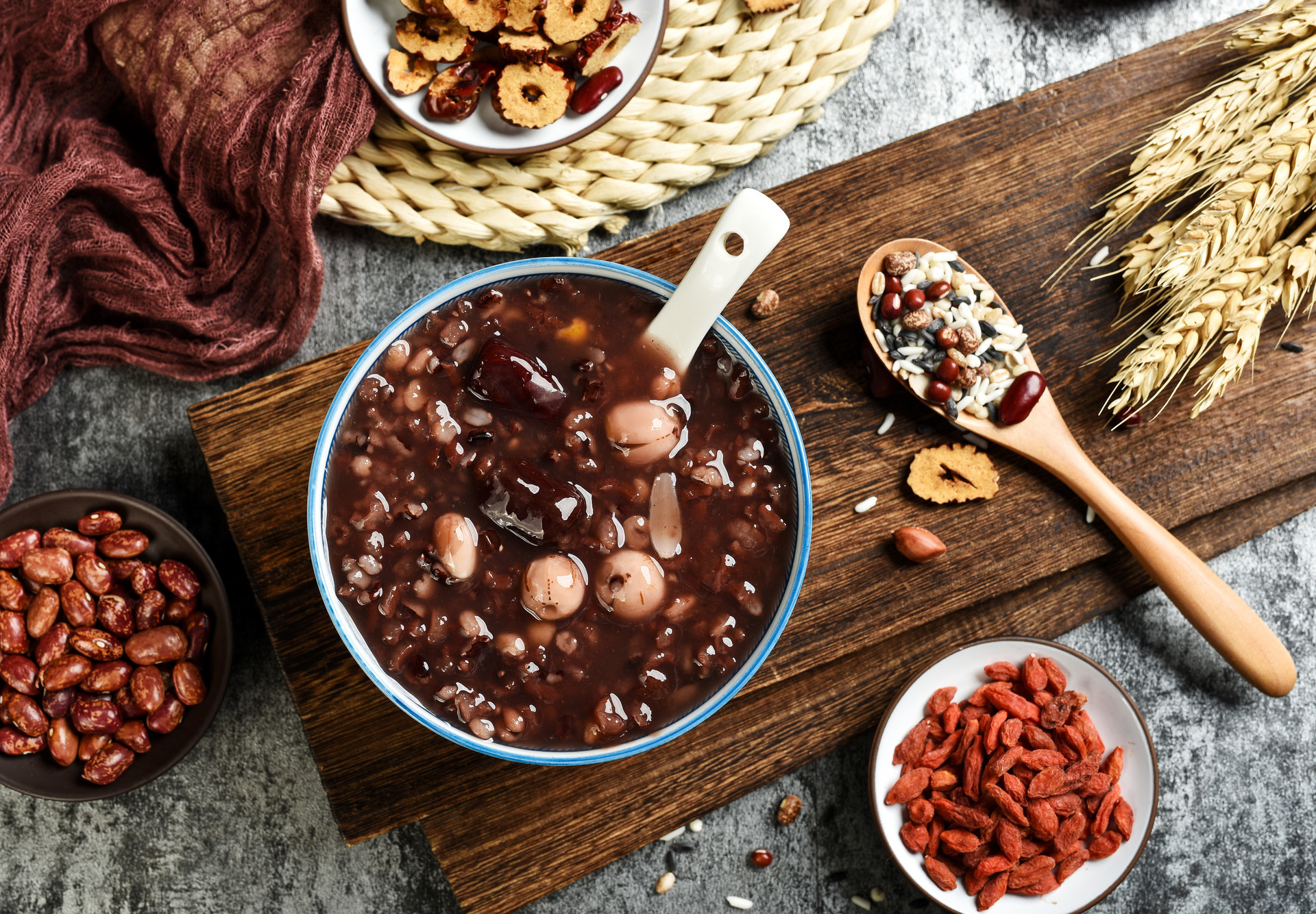 糯米50g,薏米50g,黑米50g,花生50g,桂圆50g,大红枣50g,莲子50g,赤小豆100g,白糖适量