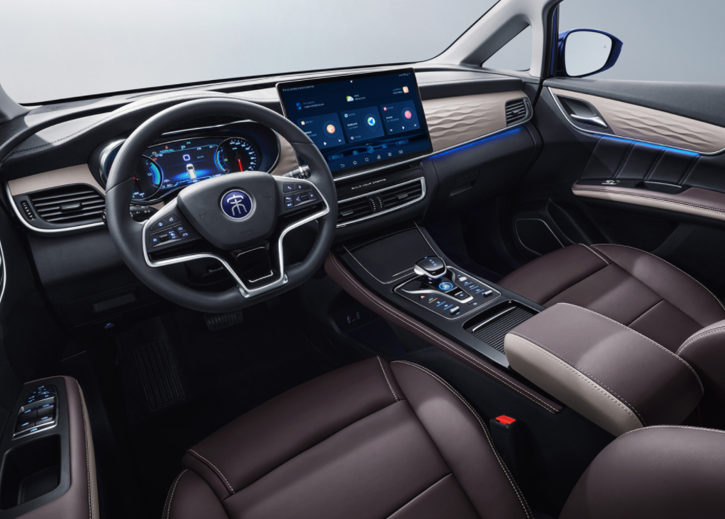 2022款比亚迪宋MAX DM-i的内饰也进行了一些调整,中控台和两侧车门版采用了波纹的设计,换挡杆换装了更加小巧的电子换挡机构,并保留了很多的实体按键,整体营造出非常不粗的精致感,同时全液晶仪表和大尺寸的中控屏也没有缺席。
