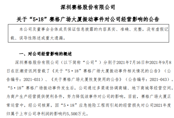 近日,深圳赛格股份有限公司发布《关于“5·18”赛格广场大厦振动事件对公司经营影响的公告》。公告称,“5·18”赛格广场振动事件发生后,公司通过多渠道协调商铺、地下商城等经营空间,为商户生产经营提供便利条件,努力降低该事件对公司的影响。目前,赛格广场大厦正常运营中,经公司核算,因“5·18”应急抢险工程而引起的经营损失对公司2021年度归属于上市公司净利润的影响约为5500万元。