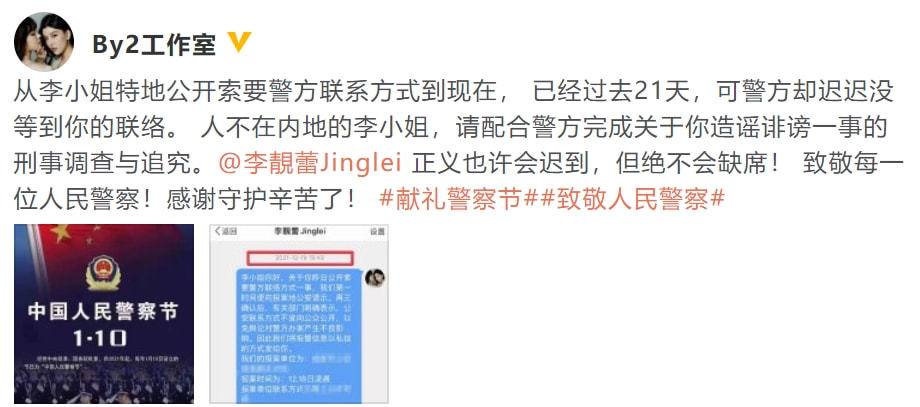 据了解,在王力宏和李靓蕾离婚风波后初次会面后,By2工作室再一次现身喊话李靓蕾,并表示李靓蕾公开索要警方联系方式后就再无消息,怒斥李靓蕾造谣诽谤,希望李靓蕾能够承担责任,在内容的最后还表示「正义也许会迟到,但绝不会缺席」。