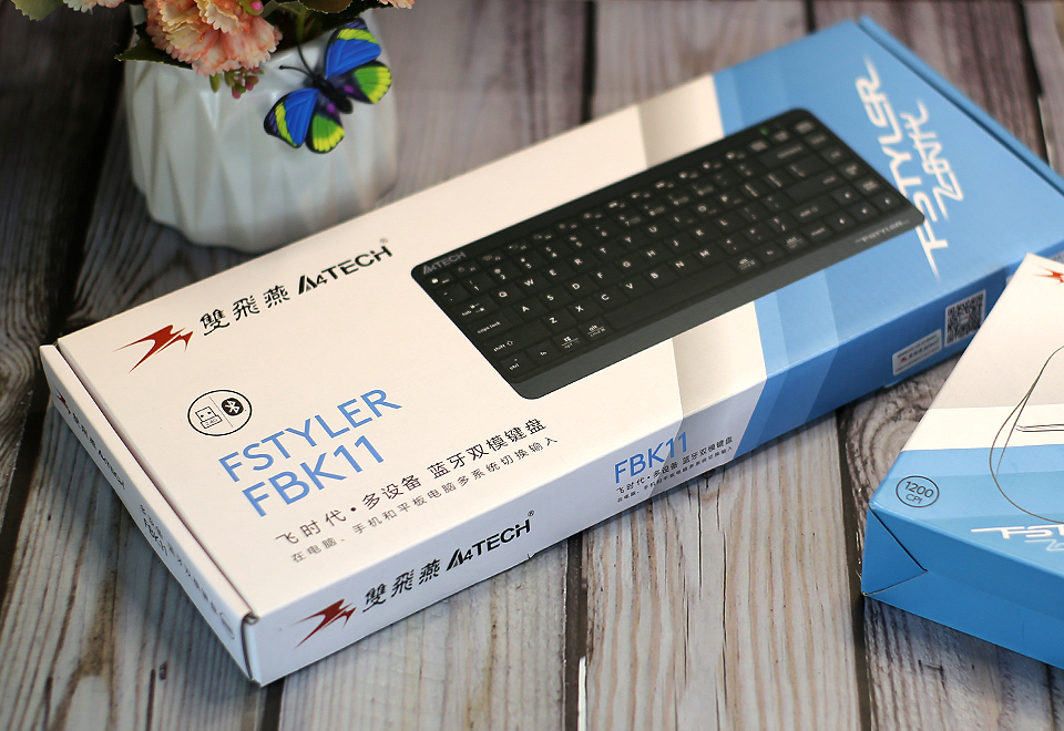 无线键盘这类产品,主要也就是搭配平板,手机等作为外设,无需追求太过高端的款式。双飞燕这款飞时代Fstyler系列的FBK11双模无线键盘定位还是非常亲民的,入手也没啥压力,这也是我选择它的原因。产品的包装设计采用了彩色印刷的纸盒,上面带有产品品牌标示以及型号。