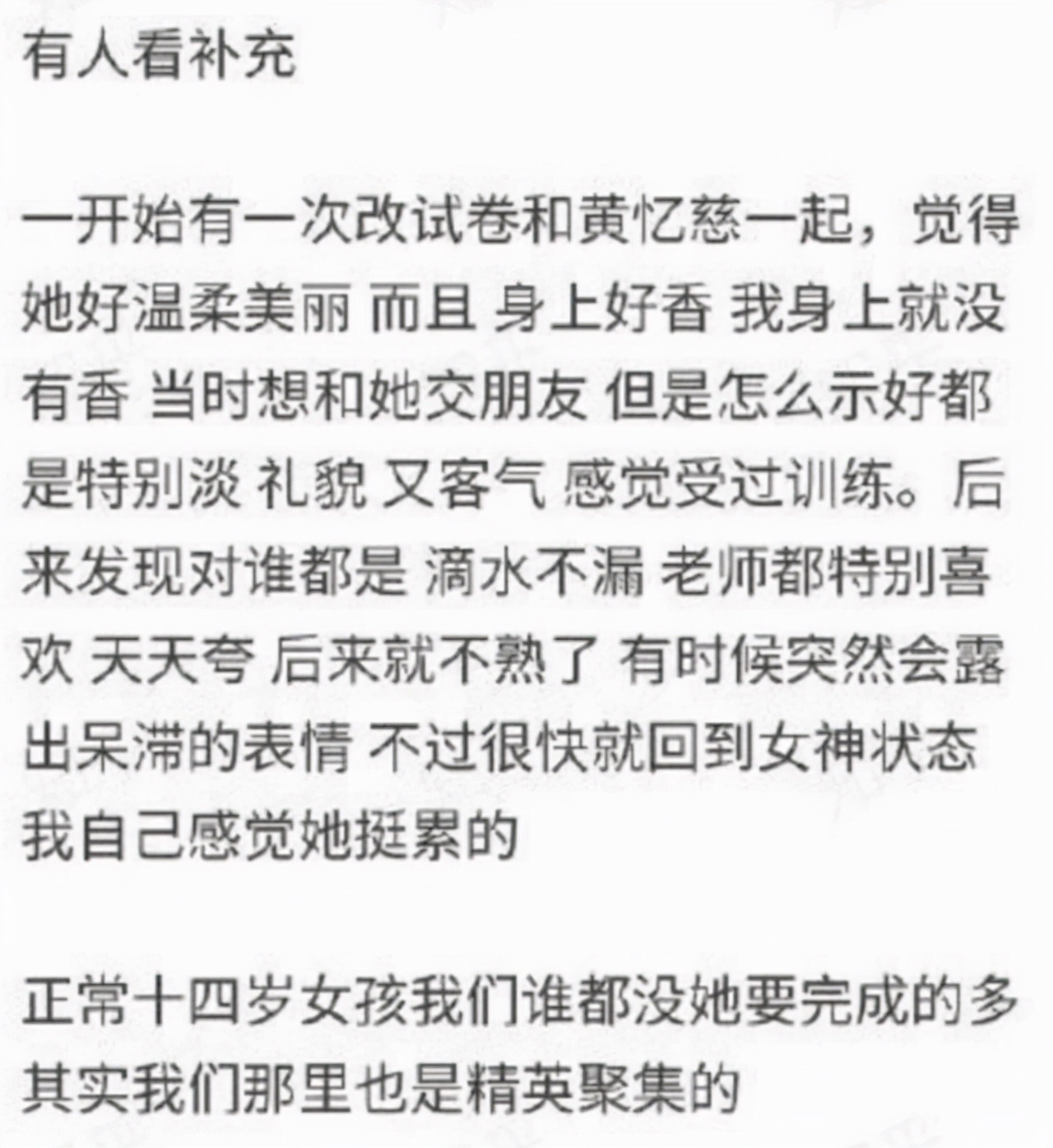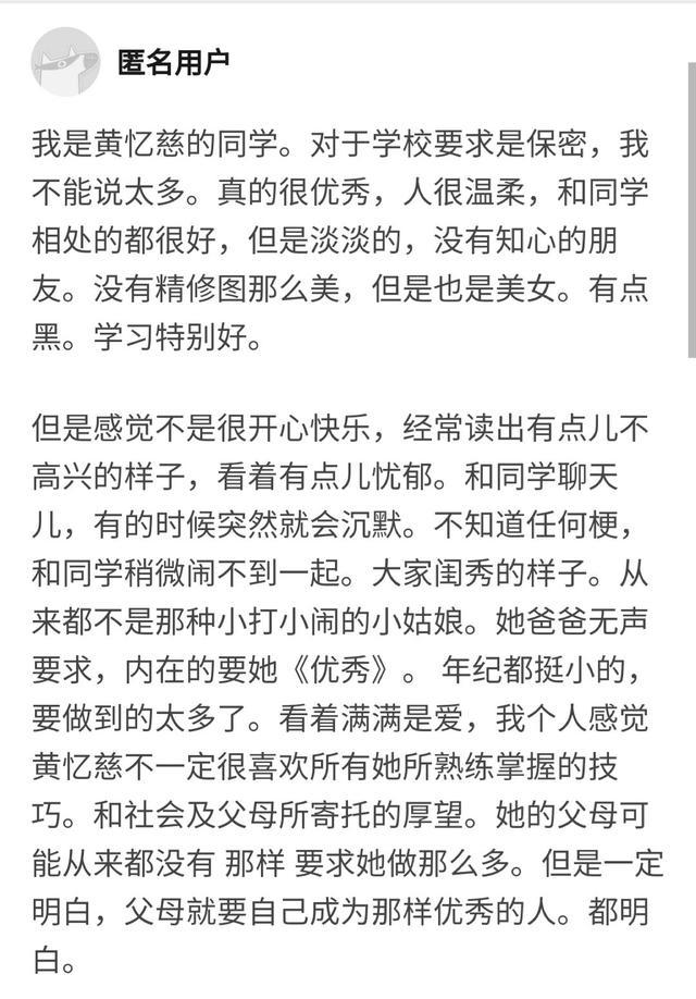 之前网上还流出过一段自称是黄忆慈(黄多多)的同学的爆料,称黄多多真的很优秀,人很温柔,和同学相处很好。但是淡淡的,没有知心的朋友,真人有点黑,没有精修图那么美。