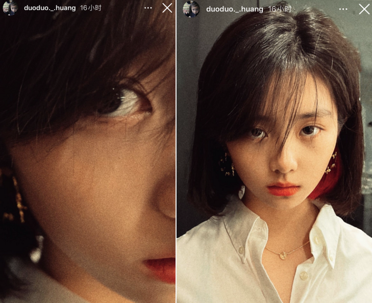 照片中,黄多多披着头发,穿着白衬衣涂着红唇,耳朵后面一撮挑染的红发也格外显眼。