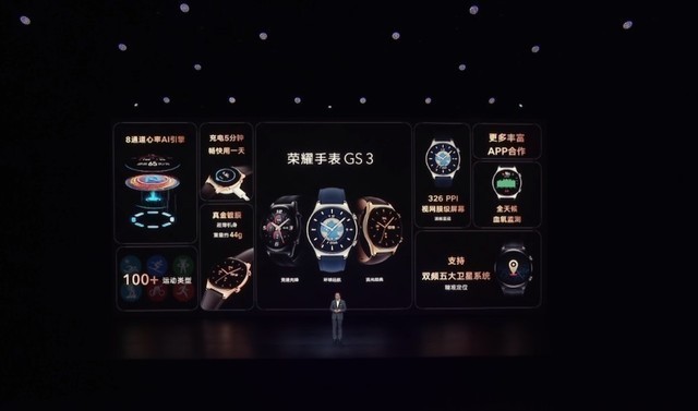 中关村在线消息:在介绍完了荣耀Magic V之后,赵明开始为用户介绍荣耀手表GS 3。其采用1.43英寸的AMOLED超视网膜屏,支持最高1000nits亮度,像素密度326PPI。其整体表身采用85%含量的真金镀膜,表带采用Nappa头层小牛皮。荣耀手表GS 3支持多种丰富表盘,整体创意非凡。