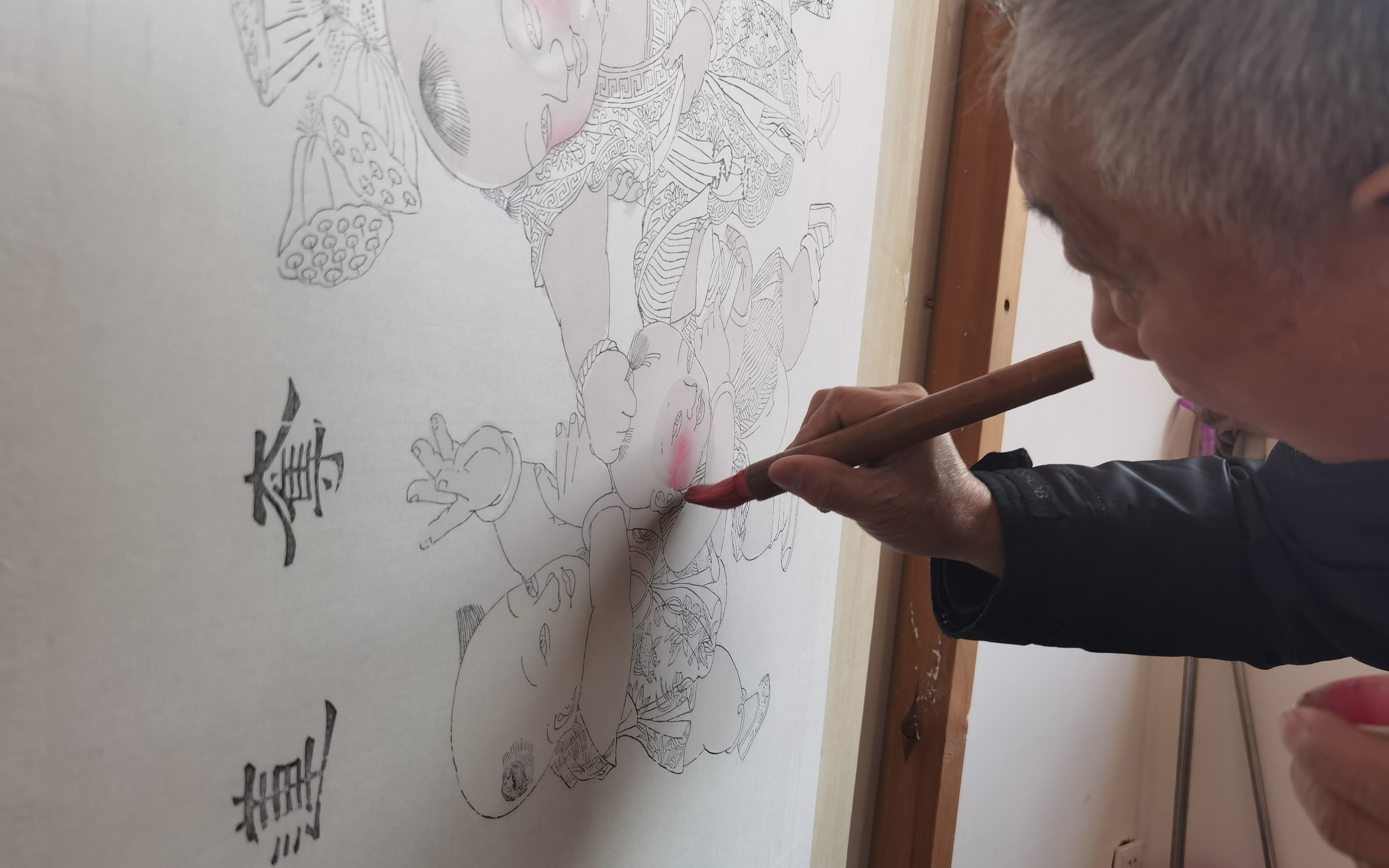 彩绘的各个步骤才是杨柳青年画的精髓。霍庆顺端着调色碗,一手拿着扁笔,开始在“画门子”上给年画娃娃的脸蛋儿上色。