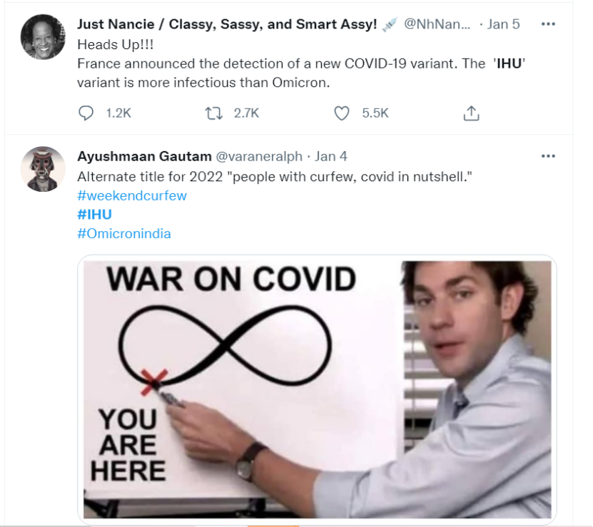 新变种的出现加深了大家对疫情的担忧,有不少网友在社交媒体上抱怨,说新年伊始,变种连连,“IHU”变种正是“I hate you”的缩写,还有“热心”网友提醒大家“IHU”比omicron更具传染性。