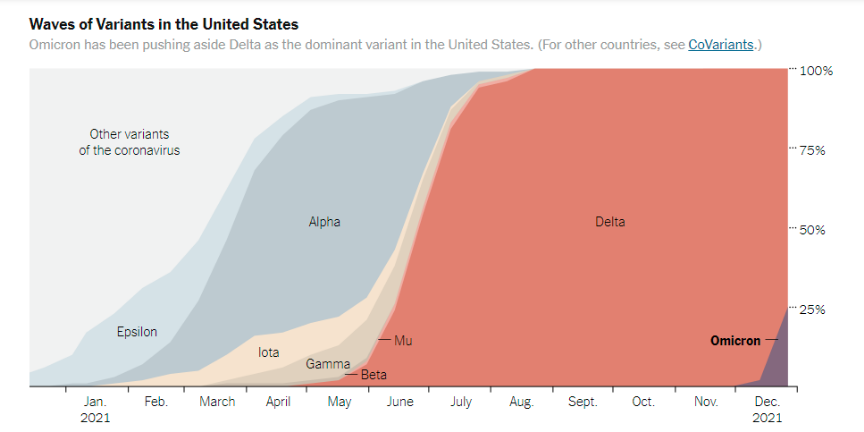 2021年,美国新冠病毒变种的感染比,截图来自纽约时报