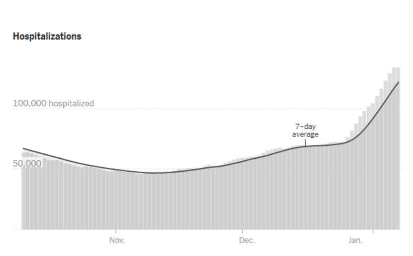 但实际上由于Omicron变种的感染速度更快,已经造成加拿大、美国等受到Omicron浪潮严重袭击的国家医院人满为患。从1月1日开始,美国每日新增新冠感染患者入院人数都超过了10万人,每日新增病例在1月7日达到了有记录以来的最大值134多万人。