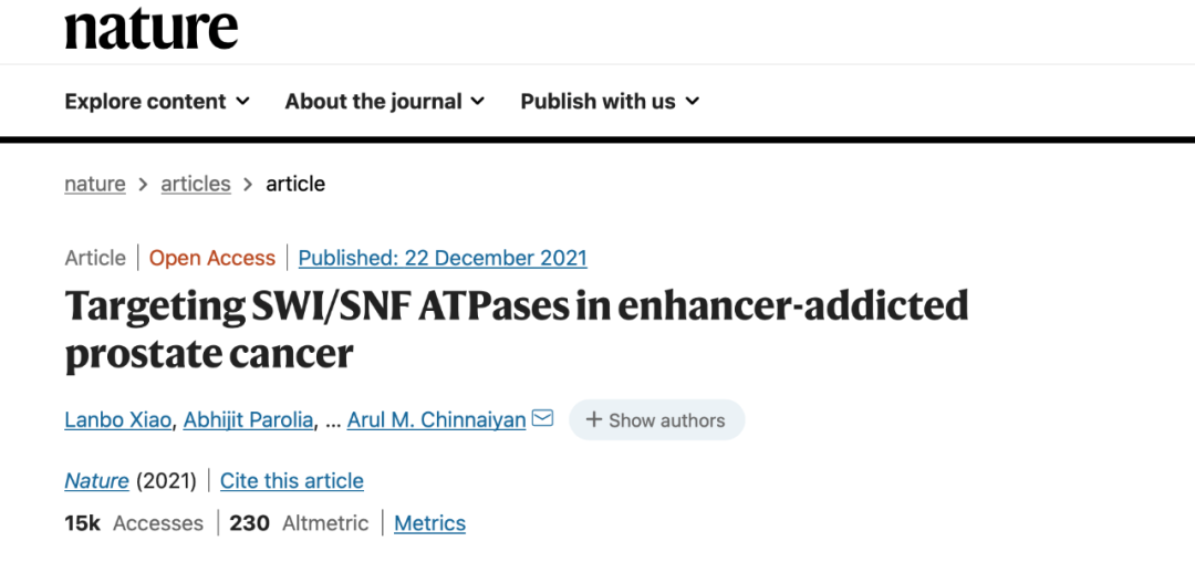 2021 年 12 月 22 日,美国密歇根大学转化病理学中心阿鲁·奇尼安(Arul M. Chinnaiyan)博士团队在 Nature 上发表了一篇研究论文,题为 Targeting SWI/SNFATPases in enhancer-addicted prostate cancer,论文的共同第一作者是肖兰博博士[1]。