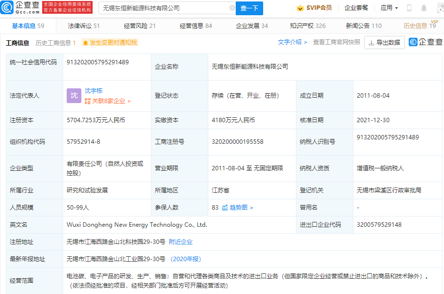 企查查信息显示,东恒新能源从事于高性能锂离子电池碳负极材料及碳纳米管导电剂、导电浆料的生产,产品应用于能源、汽车制造、电子产品等领域,其公司成立于2011年,法定代表人为沈宇栋,注册资本5704.73万元人民币,经营范围包含:电池碳、电子产品的研发、生产、销售等。