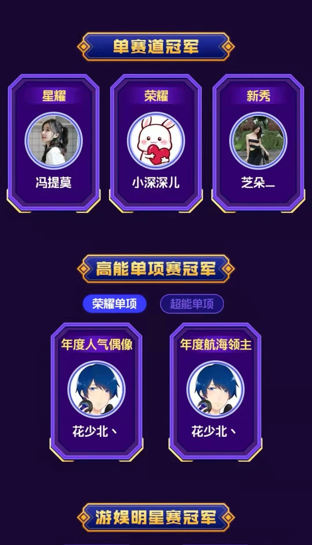 当然了,除了这三位美女主播以外,还有一位备受欢迎的男主播,他就是花少北,想必小伙伴也久仰他的大名了。他不仅拥有高颜值,更是出了名的才子,给我们带来了很多优质的内容,也是当之无愧的高能单项赛的冠军,他荣获“年度人气偶像”和“年度航海领主”的称号,这两个奖项也是大家给予他的肯定,他也的确给我们带来了不少优秀作品。