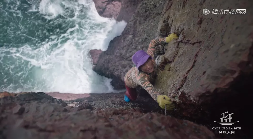 闫九俭不是《风味人间3》里唯一的侠客。浙江舟山群岛的绝壁上,58岁的陈玉香艺高人胆大,顶着风浪与姐妹们在湿滑的礁石缝隙中采摘佛手螺——没有安全装备,胶鞋与手套是唯一的保护。