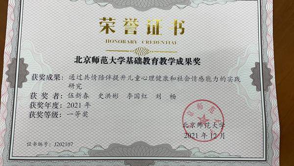 近日,由北京师范大学心理学部伍新春教授主持,史洪彬、李国红、刘畅主要参与的“通过共情陪伴提升儿童心理健康和社会情感能力的实践研究”获得北京师范大学基础教育教学成果一等奖。