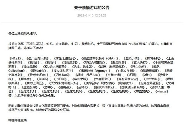 近日,B站(哔哩哔哩)官方发出“关于禁播游戏的公告”。公告内容显示,B站官方应文化部等监管部门要求禁止直播血腥暴力色情内容的游戏对游戏直播内容把关,加强自审自律,规范平台直播秩序,创造良好的网络文化环境。禁播游戏名单中包含多款3A游戏作品。