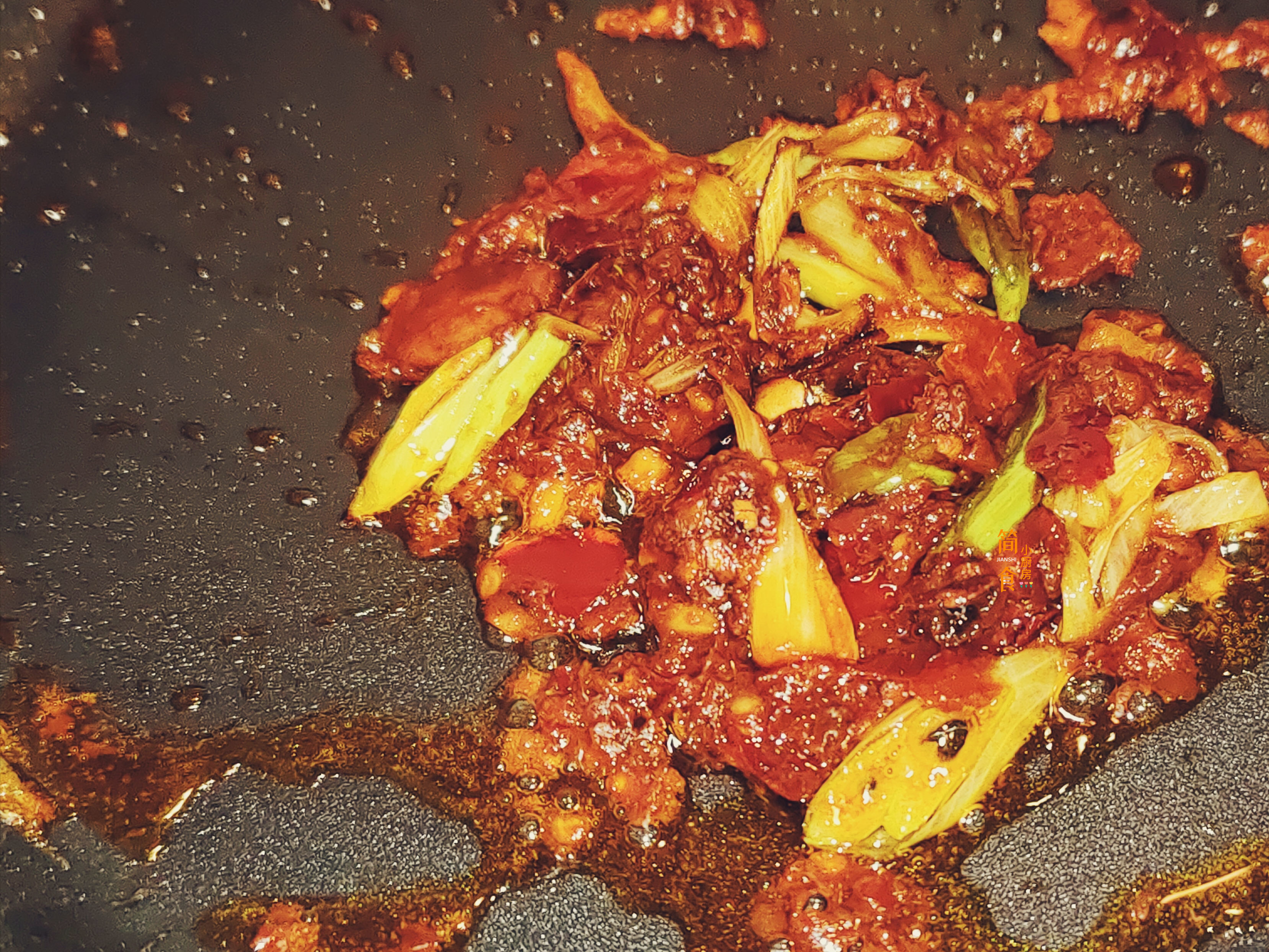 3、另起锅烧油,放入葱丝姜末爆炒出香味,再倒入一勺郫县豆瓣酱,小火煸炒煸香,炒出红油。