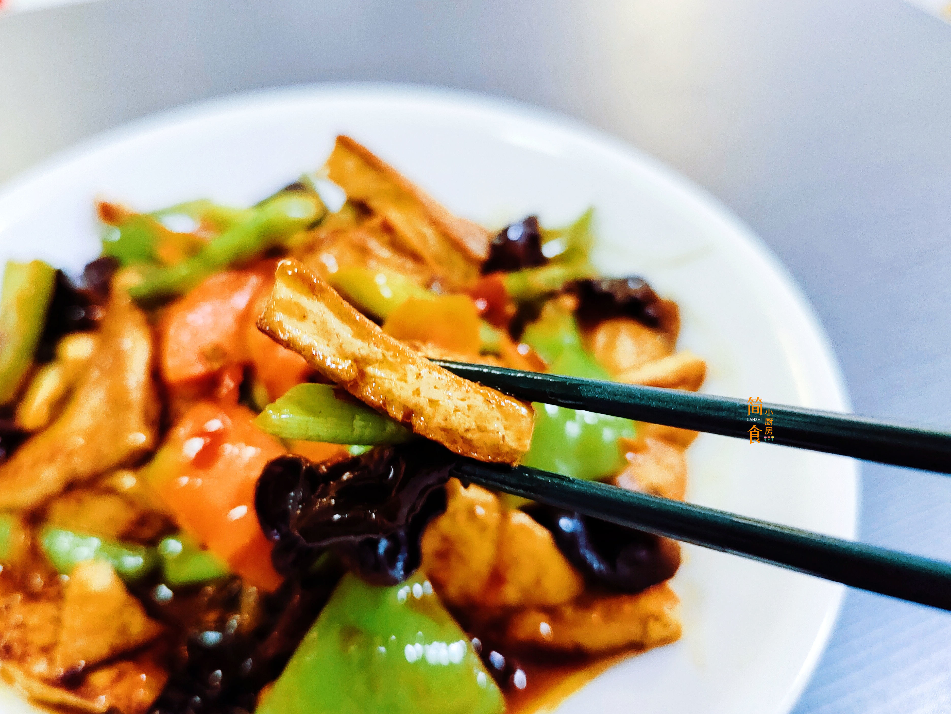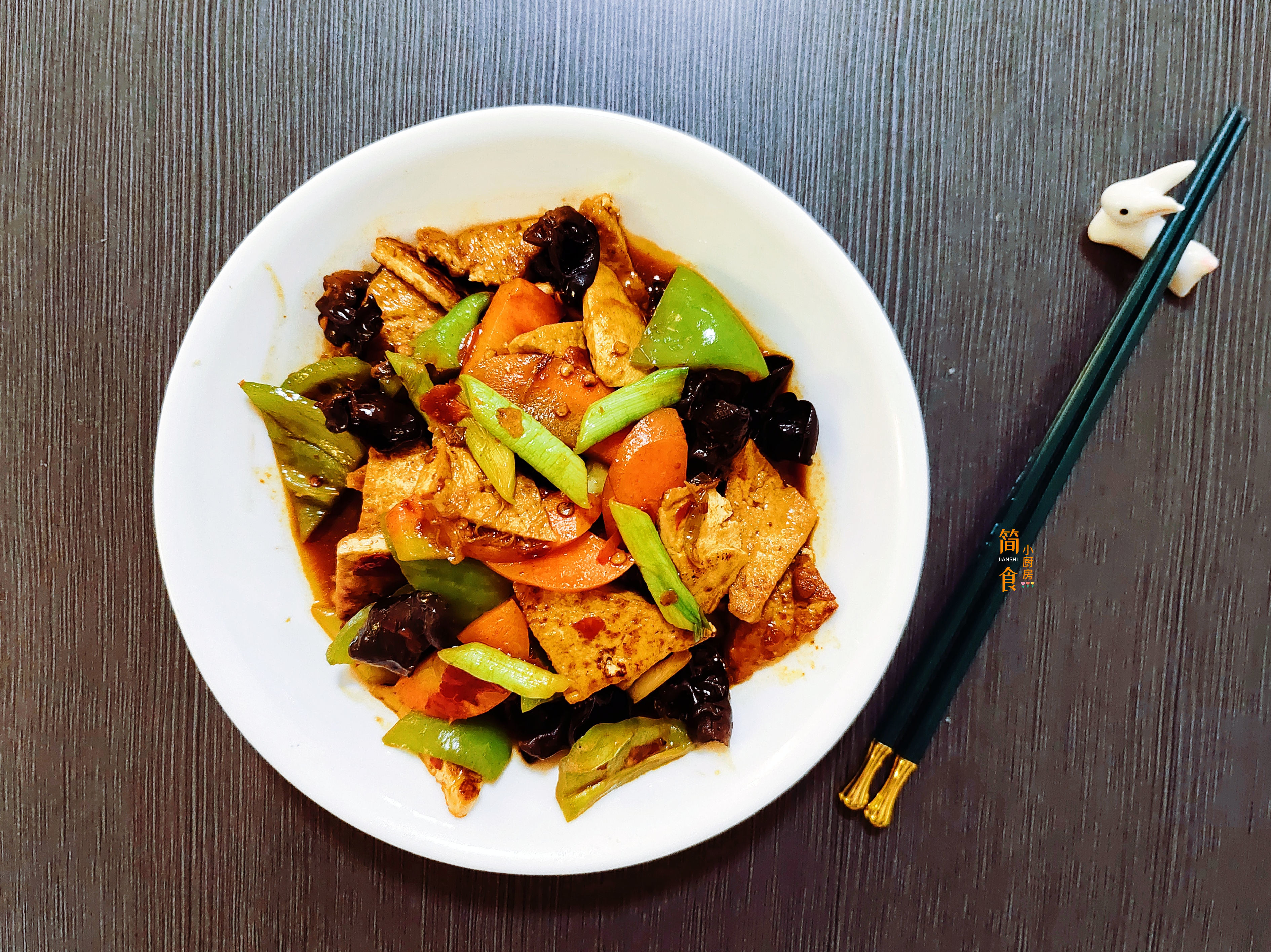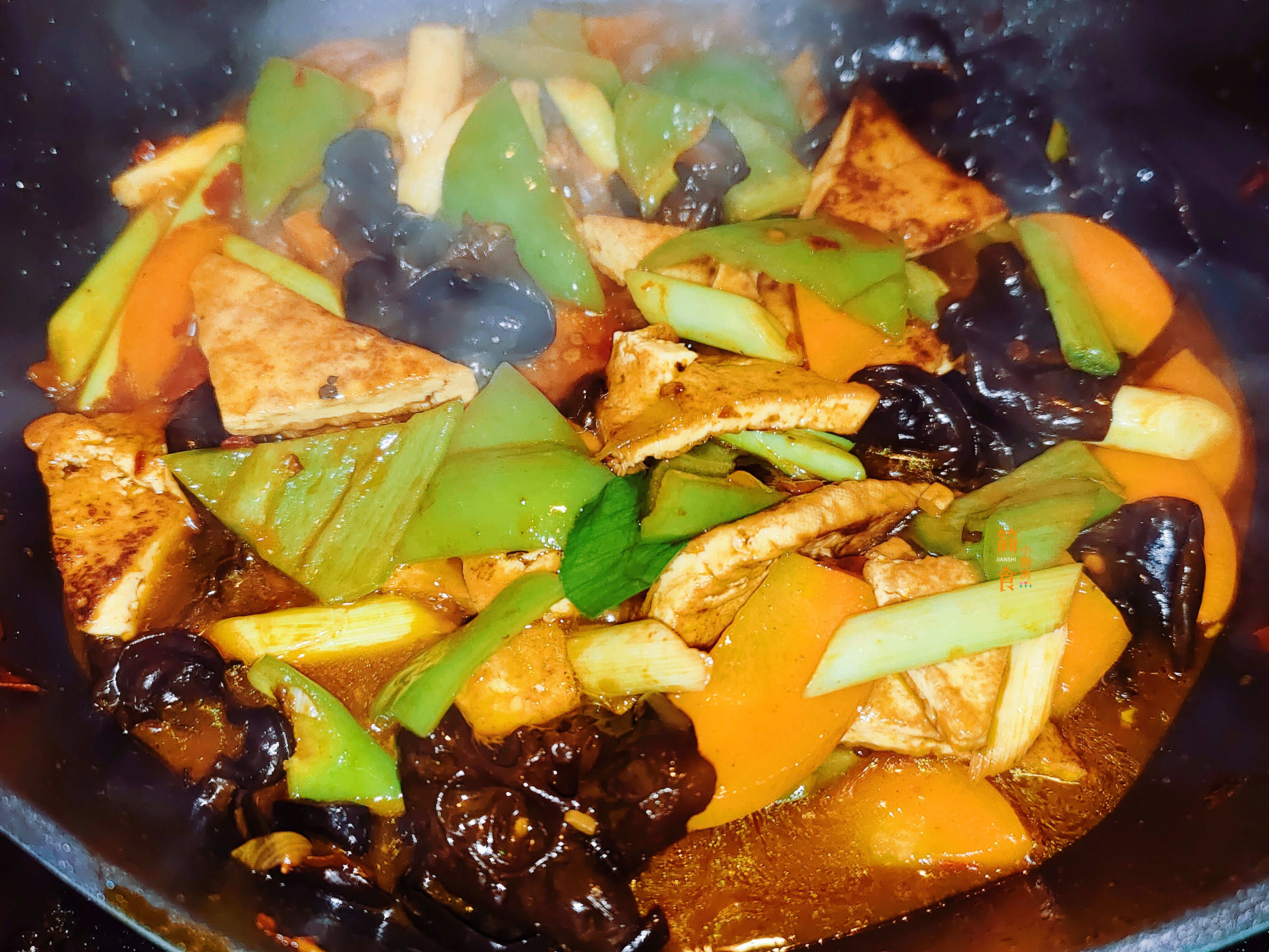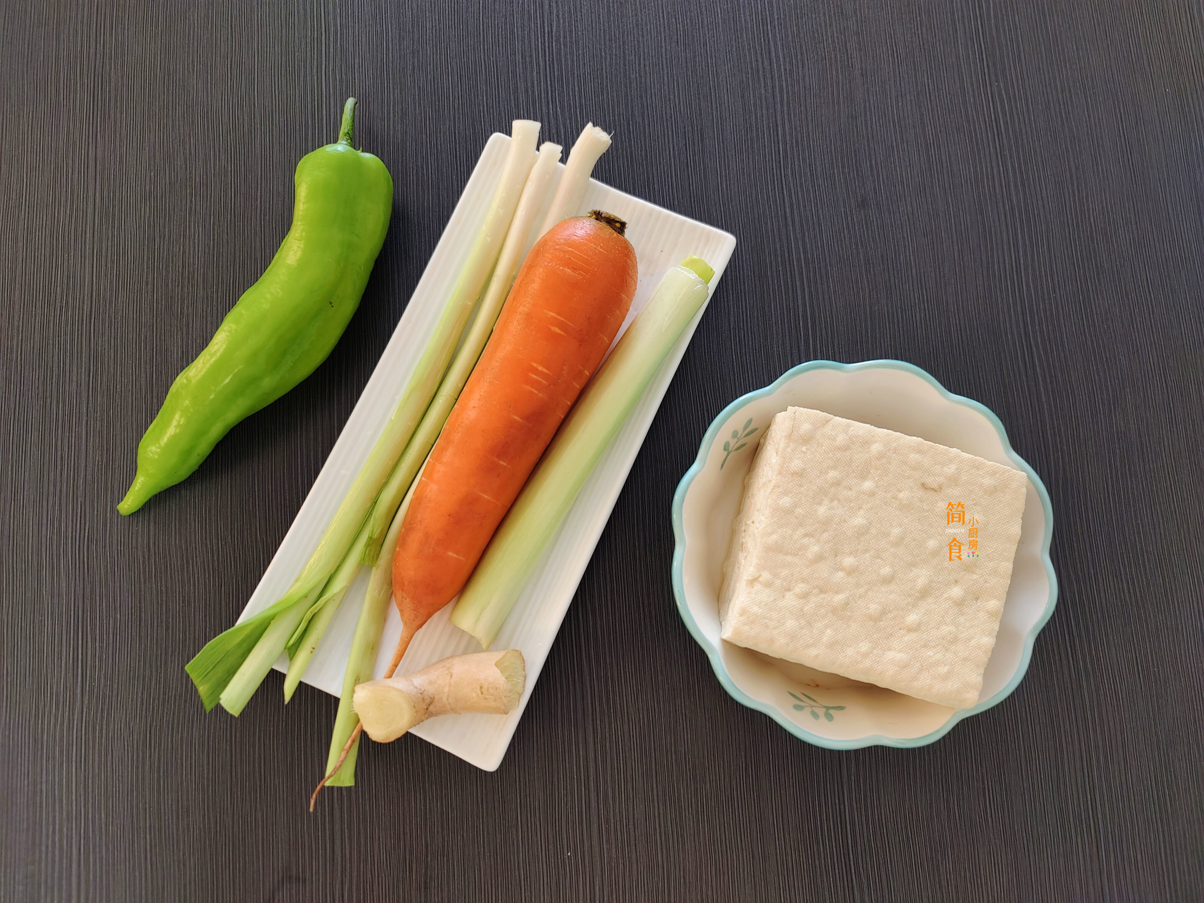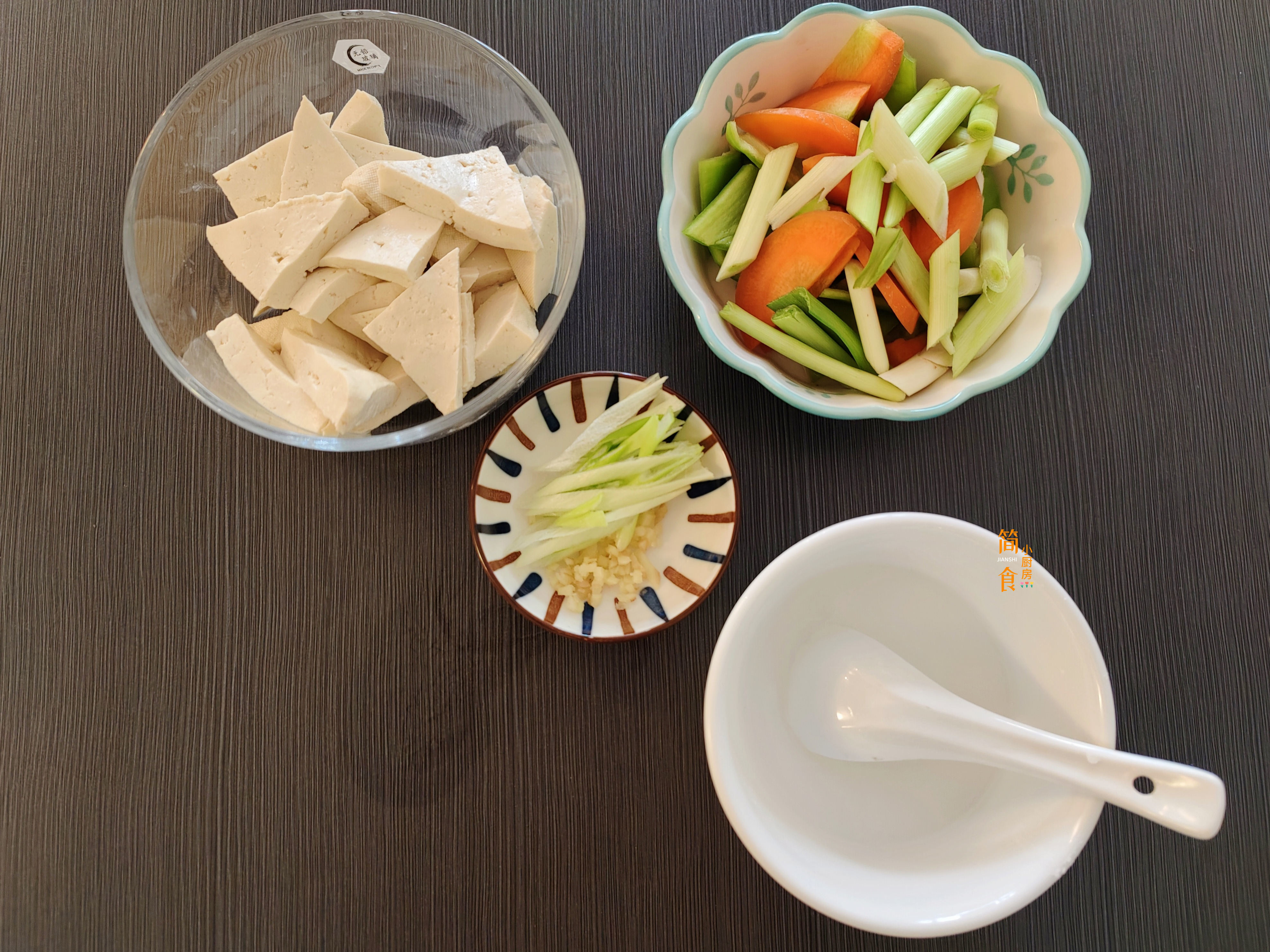 【食材准备】老豆腐,木耳,青椒,胡萝卜,青蒜苗,葱丝,姜末