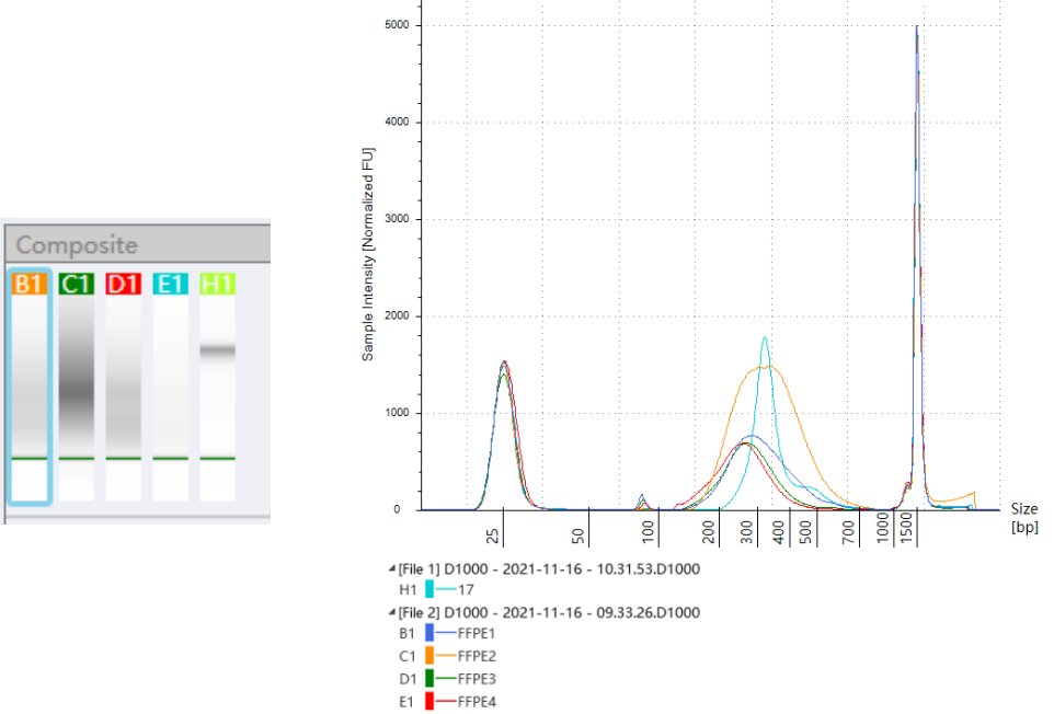 (左为胶图形式显示,右为峰图形式显示。A1为分子量Marker,H1为FFPE DNA标准品。 )