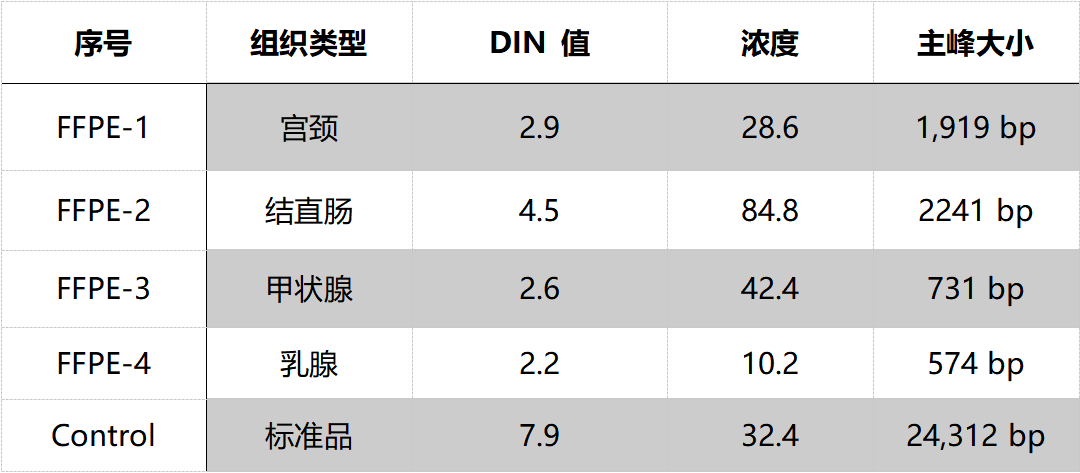 表1. 通过MGIEasy FFPE基因组DNA提取试剂盒提取的DNA,由4150 TapeStation分析所得的质量参数信息。