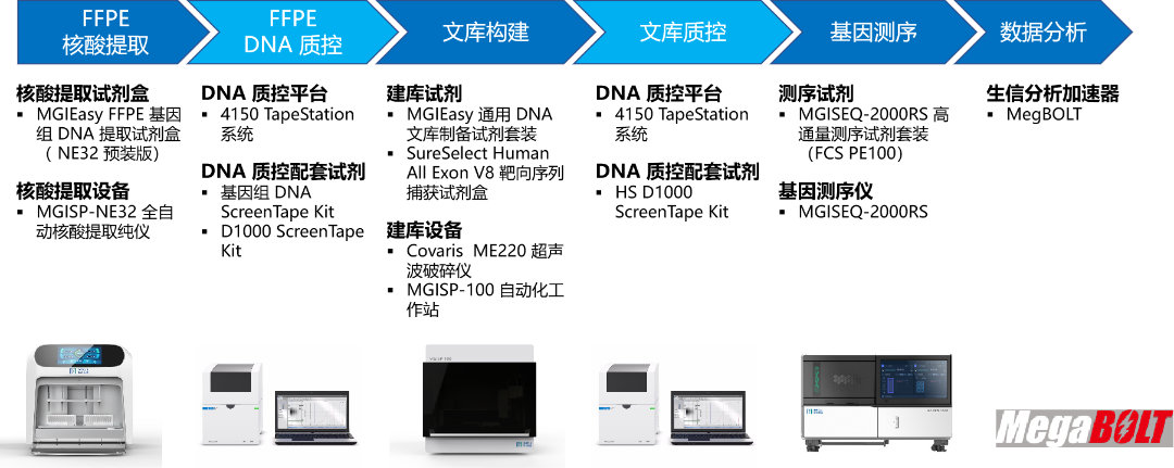 图1. 此次FFPE样本NGS实验的流程及所涉及仪器平台与试剂。