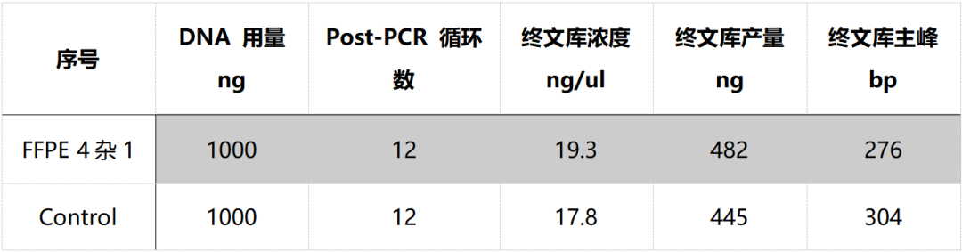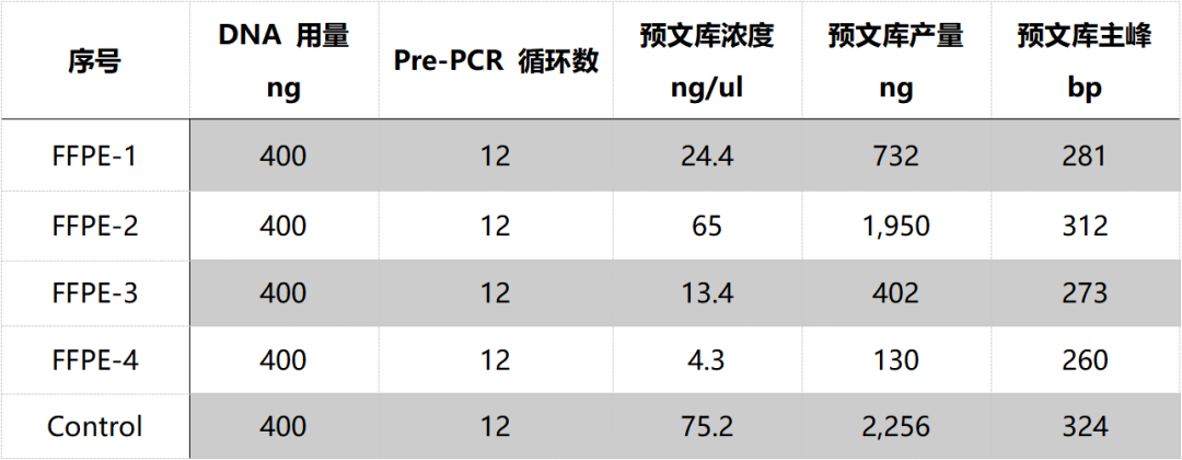 表2. 超声打断后用于构建预文库的DNA用量、捕获前预文库的扩增循环数、预文库浓度,产量与片段大小。