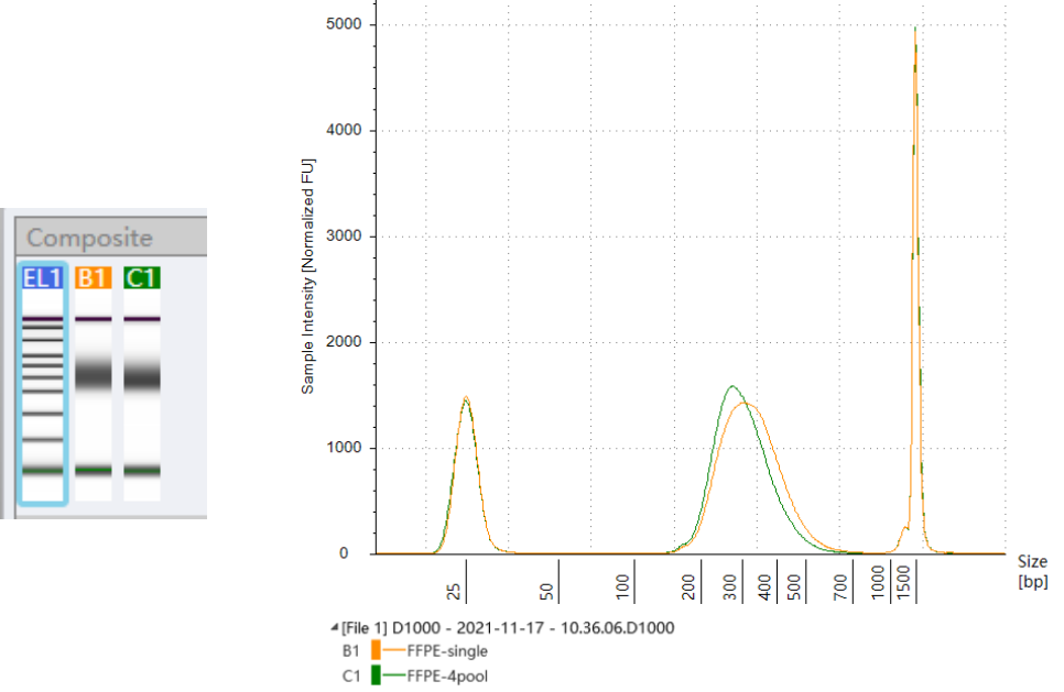 图5. 使用TapeStation 4150系统与HS D1000 ScreenTape与试剂分析终文库的质量。B1为标准品,C1为 FFPE样本4杂1。
