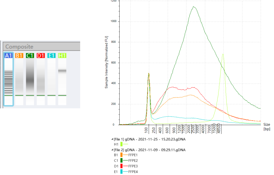 图3. 使用4150 TapeStation系统与基因组DNA ScreenTape胶条和试剂分析FFPE样本纯化所得的基因组DNA。
