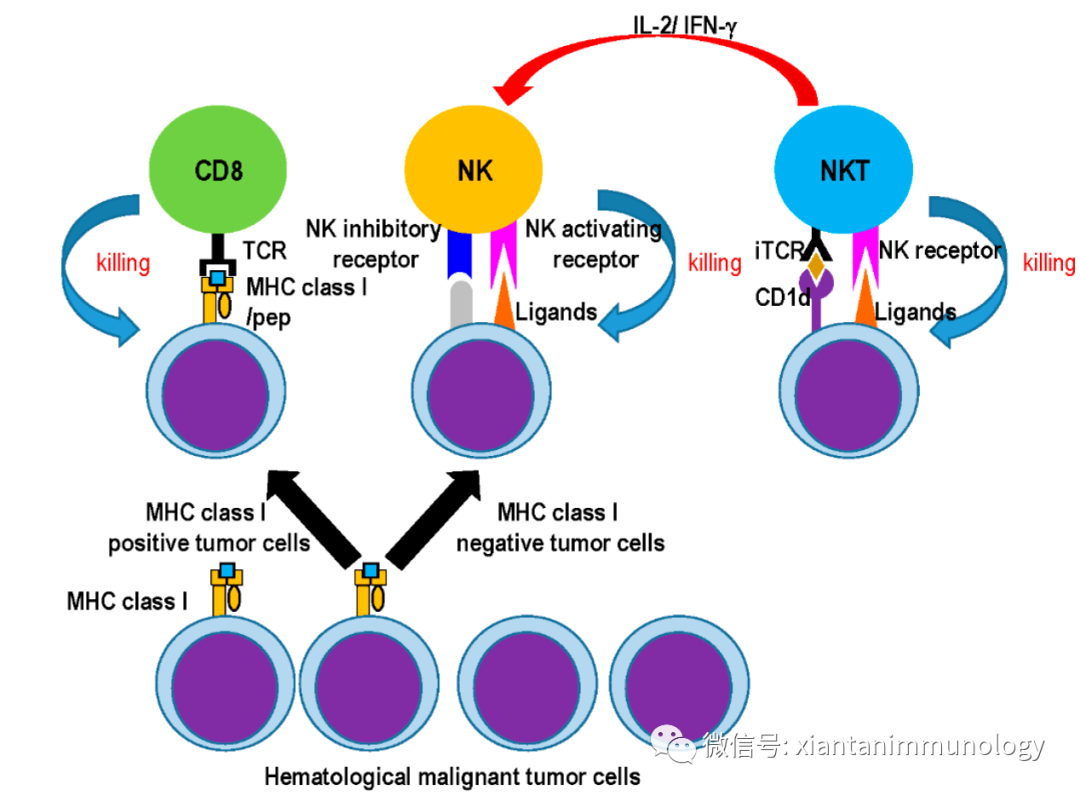 NKT细胞是一种特殊的T细胞,能够识别CD1d相关的脂质抗原,即使在没有T细胞受体信号的情况下也能对炎症因子作出反应,因此这些细胞具有先天和适应性细胞样特征。NKT细胞已被描述通过多种直接(肿瘤细胞裂解)和间接(TH1细胞细胞因子表达和TME中调节免疫抑制细胞)机制有助于有效的抗肿瘤免疫。合成激活的NKT细胞恢复了耗尽的CD8+T细胞的效应功能,从而在体内对PD1阻断产生反应,表明这些抗肿瘤免疫细胞之间存在积极的相互作用。因此,肿瘤浸润性NKT细胞的数量与人类恶性肿瘤的良好临床结果呈正相关,包括神经母细胞瘤和CRC。循环NKT细胞的一种特定亚型的增加,也预测了头颈部癌症患者对治疗的更好反应,低NKT细胞频率和高CD1d表达与慢性淋巴细胞白血病进展相关,而NKT细胞被确定为一种新的潜在的慢性淋巴细胞白血病预后参数。
