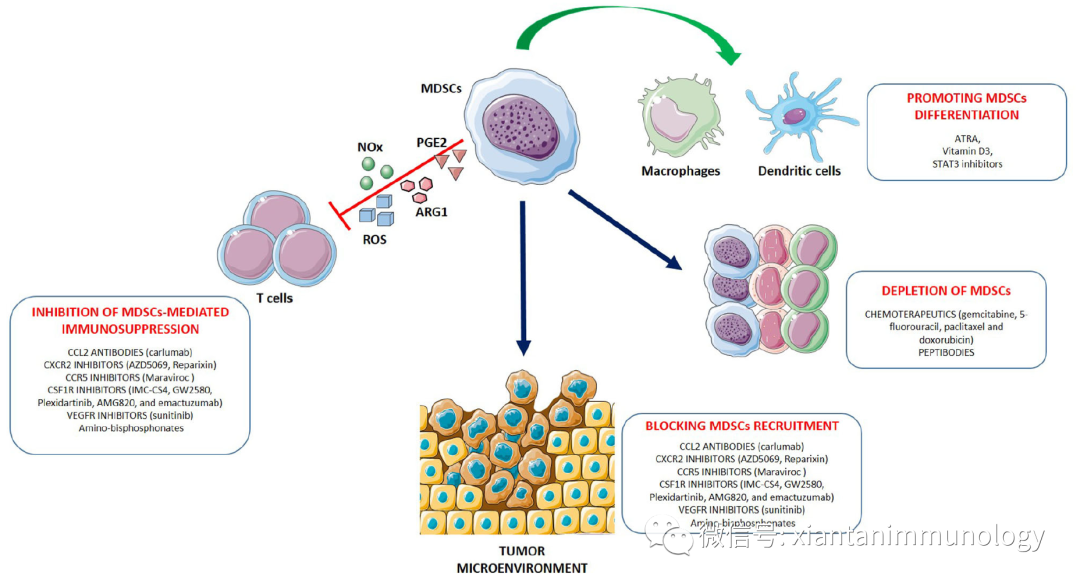 在恶性环境中,M-MDSCs可以进一步分化成TAMs。在机制上,来自人肺鳞状细胞癌的MDSCs导致CD8+T细胞凋亡增加和肿瘤细胞凋亡减少。所有瘤内MDSCs均显示出强大的免疫抑制能力,从而支持癌症进展和转移性扩散。