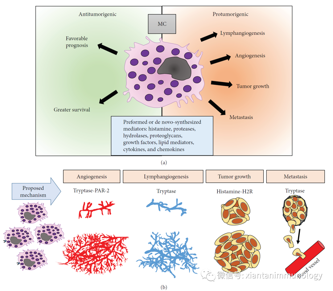TAMCs在前列腺癌和乳腺癌等实体癌中具有阳性预后价值;然而,其密度也与其他癌症类型中的生存率降低相关。TAMCs的增加与肿瘤细胞的淋巴结浸润有关,这可能表明这些细胞在肿瘤扩散中起了作用。不同的刺激似乎决定了TAMCs释放不同的介质混合物。