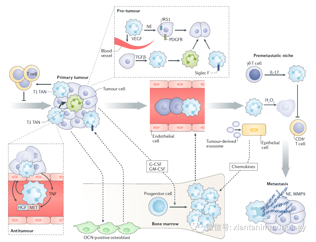 肿瘤相关肿瘤中性粒细胞释放各种介质,参与细胞外基质重塑、血管生成和促进肿瘤生长和侵袭。通过对14种癌症类型的肿瘤转录组分析,证实中性粒细胞是与最差预后相关的免疫细胞群。
