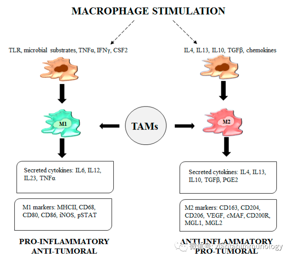 巨噬细胞是组织驻留的分化单核细胞,其吞噬活性根据其分化状态和功能作用通常分为M1和M2亚型。M1巨噬细胞具有其促炎性特性(如分泌IL-12和活性氧等),从而促进抗肿瘤Th1型反应;M2巨噬细胞是抗炎性质,分泌IL-10,TGFβ和其他有利于建立耐受性微环境的介质,以及促血管生成因子。