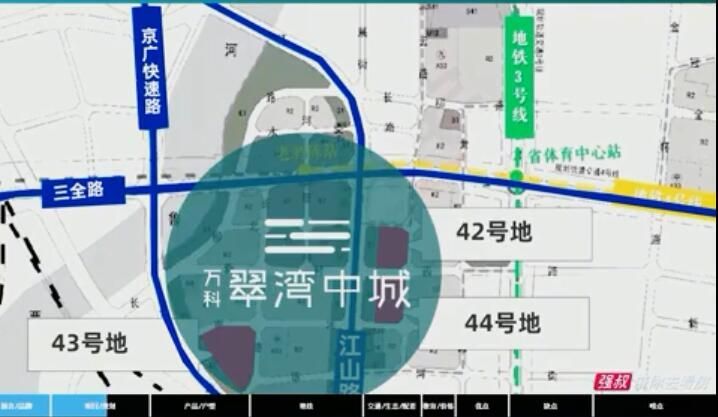 3个地块以江山路为界 分为东西两大版块,江山路以东是42、44号地,案名璟曦园和悦曦园。产品面积为128-143平,由10栋31-33层的高层组成。江山路以西是43号地,案名翠澜园。产品面积为97-120平,由6栋高层组成。